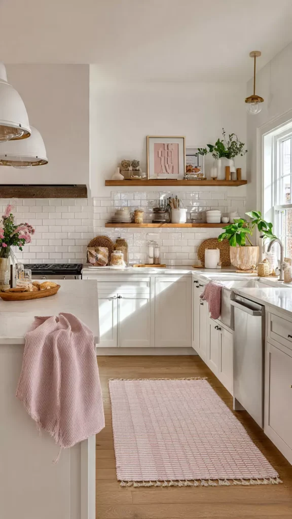 Rugs, dish towels, and countertop accessories bring pink into the kitchen without permanence. These pieces soften the space and add warmth instantly. I love swapping them seasonally for a fresh feel. Doesn’t small change sometimes make the biggest difference? This approach keeps things flexible.