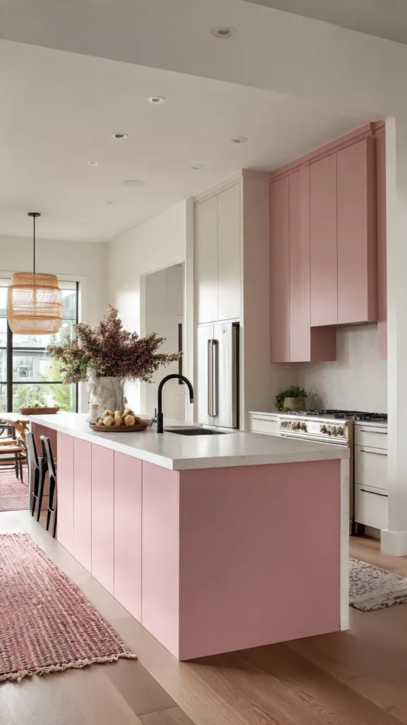 Blush cabinets bring an instant sense of warmth while still keeping things modern and polished. When paired with flat-panel doors and minimal hardware, the pink reads sophisticated instead of sweet. I love how this shade shifts throughout the day, glowing softly in the morning and deepening at night. Doesn’t it feel good when a kitchen looks calm instead of cold? This approach works beautifully in both small and large spaces.