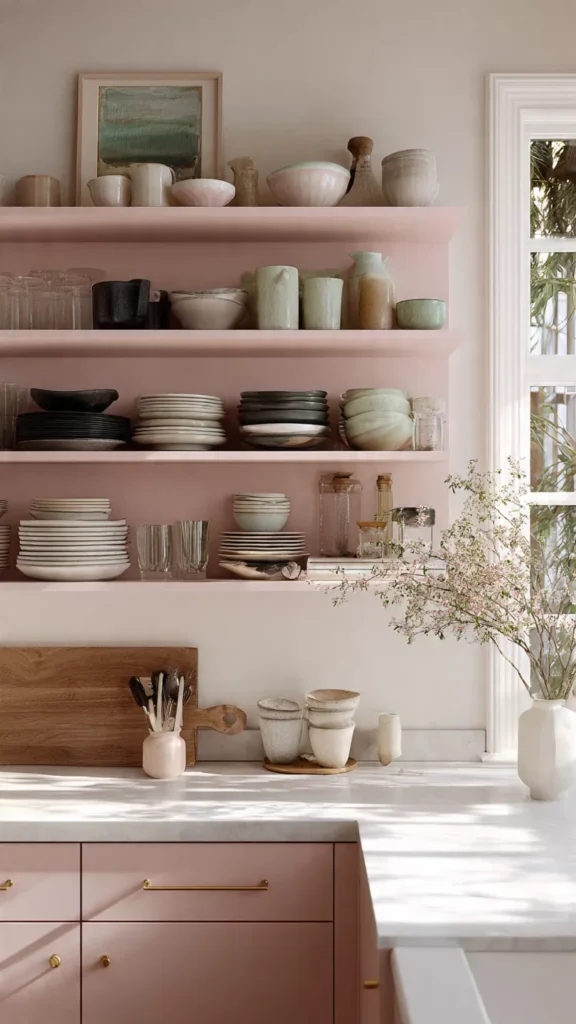 Open shelves painted pink add personality without the heaviness of full cabinetry. They give you space to display dishes, glassware, or ceramics that reflect your style. This look feels casual, modern, and a little artsy. Why hide beautiful things behind doors? Pink shelves feel expressive and fresh.