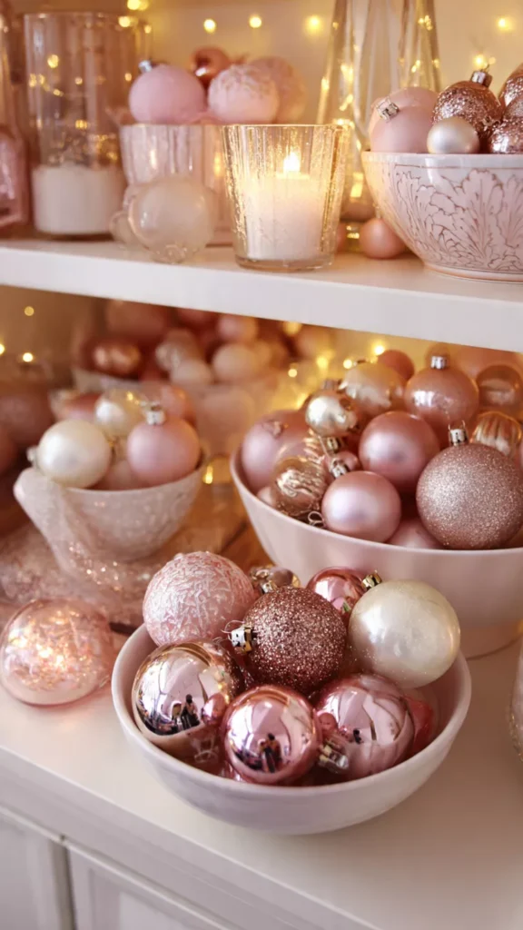 Pink ornaments don’t belong only on trees—they look gorgeous scattered around the home in bowls, on trays, and along shelves. The soft shine of rose-gold, blush matte, or frosted pink ornaments warms the room like tiny holiday jewels. I love how these little accents make unexpected corners feel festive without overwhelming them. Isn’t subtle holiday décor sometimes the most beautiful? Pro Tip: Mix round ornaments with sculptural shapes for dimension.