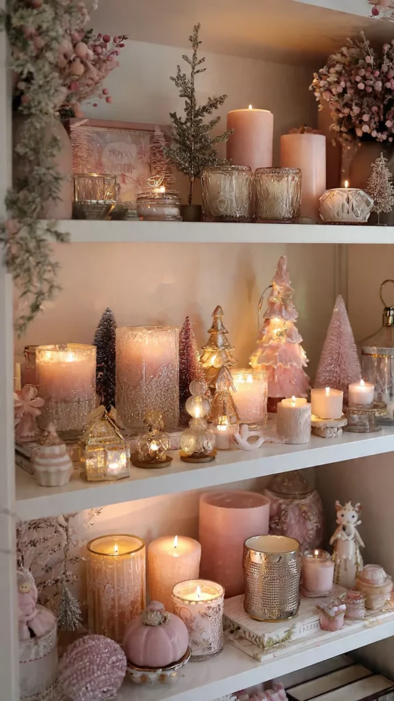 Shelves become charming holiday vignettes when adorned with pink candles, ornaments, miniature trees, and soft decorative objects. These curated touches build visual stories that feel both pretty and personal. The key is leaving breathing room so the pink elements feel purposeful, not cluttered. Isn’t shelf styling a perfect way to sprinkle magic into quiet corners? Pro Tip: Use varying heights for graceful flow.