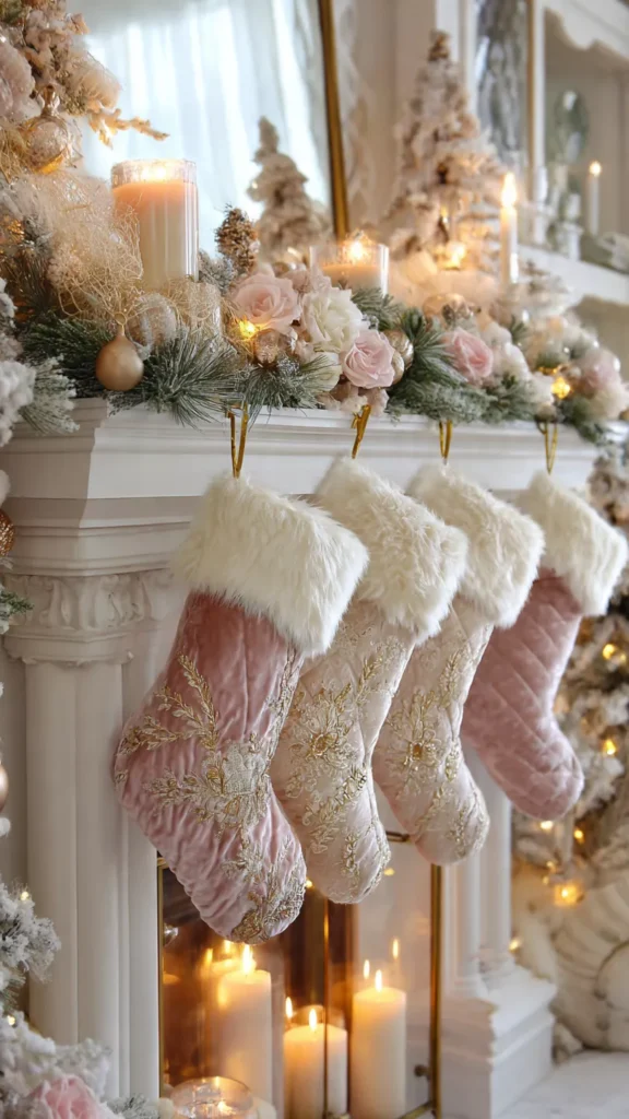 Pink velvet stockings instantly warm the room with their plush texture and delicate charm, creating a romantic focal point on the mantel. The fabric catches light beautifully, adding subtle depth without relying on sparkle or pattern to make an impact. When paired with greenery or gold accents, they create a soft, luxurious holiday mood that feels both classic and fresh. Isn’t it lovely how texture can shift a room’s mood more than color? Pro Tip: Choose stockings with gold or white embroidery to keep the look refined.