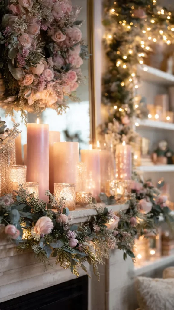 A pink-themed mantel brings soft glamour to the heart of the home through blush candles, delicate garlands, and romantic statement pieces. The palette gently softens the fireplace’s presence, creating a dreamy focal point that glows at night. When the pink accents mingle with warm lights, the whole room feels wrapped in comfort. Isn’t the mantel where all holiday magic gathers? Pro Tip: Keep one standout piece—like a rose-toned wreath—to anchor the entire design.