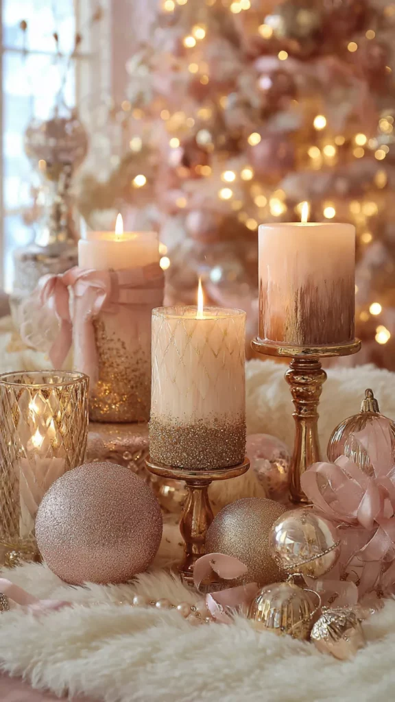 Nothing sets the tone for a soft holiday theme quite like pink candles glowing gently on a table, shelf, or mantle. Their warm flicker paired with blush-toned wax feels soothing and romantic, offering a subtle twist on traditional holiday lighting. I love grouping them in clusters so the light blooms across surfaces instead of standing alone. Isn’t candlelight the simplest way to make a space feel magical? Pro Tip: Mix different heights to add depth and visual flow.