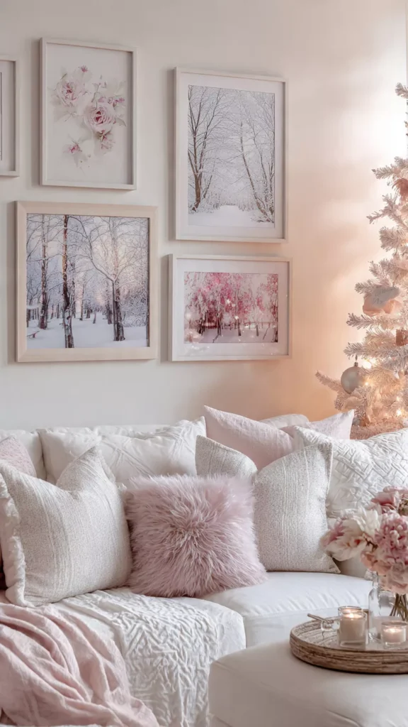 Pink-themed Christmas art—featuring winter scenes, typography, or delicate illustrations—instantly shifts the vibe of a room. These pieces create visual harmony and help connect scattered blush accents into a cohesive holiday theme. I love how wall art can change the entire emotional tone of a space with just one piece. Isn’t the wall often the most underrated part of seasonal décor? Pro Tip: Swap art prints seasonally using simple frames for easy updates.