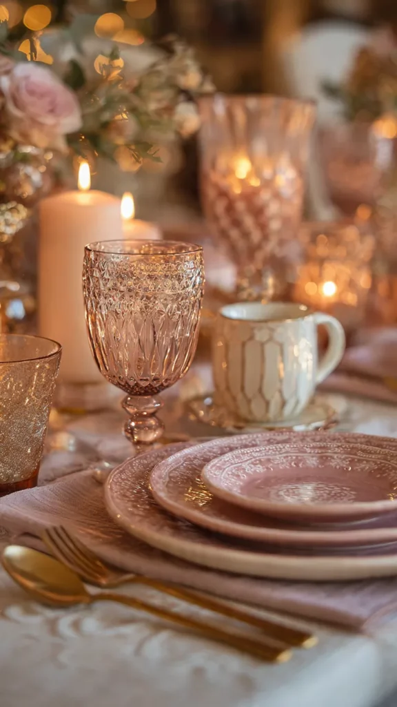Pink plates, glasses, or napkins create a soft, pretty tablescape that makes every meal feel special. Layering blush charger plates, rose-tinted glassware, and delicate textiles creates an enchanting atmosphere without feeling too formal. The tone feels intimate, warm, and perfect for cozy winter dinners. Isn’t it lovely when a table feels like a celebration in itself? Pro Tip: Ground the softness with white or gold accents for visual harmony.