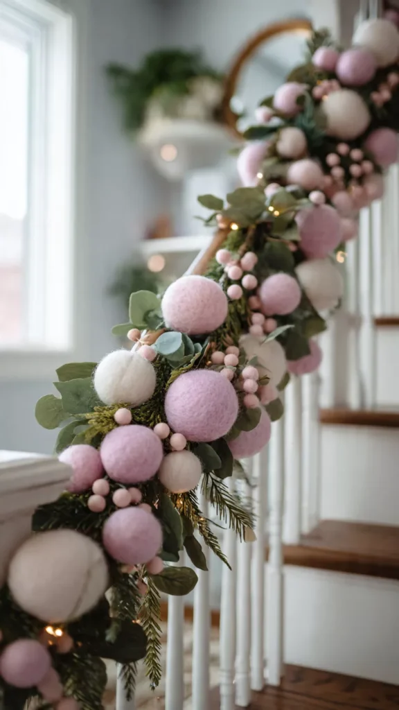 Pink garlands—whether made from felt balls, beads, or miniature ornaments—create a whimsical softness that works beautifully on shelves, mantels, or stair rails. Their delicate movement brings life to the room without overwhelming the existing décor. I love how garlands add just enough color to feel festive while staying gentle and pretty. Isn’t a little movement always more magical during the holidays? Pro Tip: Layer pink garland over greenery for depth and contrast.