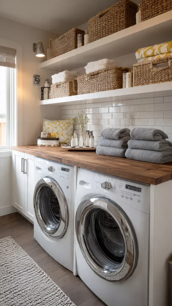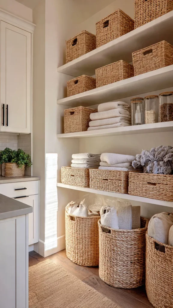 Small laundry rooms tend to look messy fast, and baskets act like quiet little miracles that hide the visual noise. Textured bins, woven baskets, or sleek labeled containers introduce style while creating organization zones you’ll actually stick to. Suddenly, clutter disappears, and your storage looks curated rather than chaotic. Honestly, nothing hits like opening a cabinet and seeing every little thing tucked beautifully into its own space. It’s tidy satisfaction at its finest. Pro Tip: Use matching baskets to create a cohesive, high-end look.