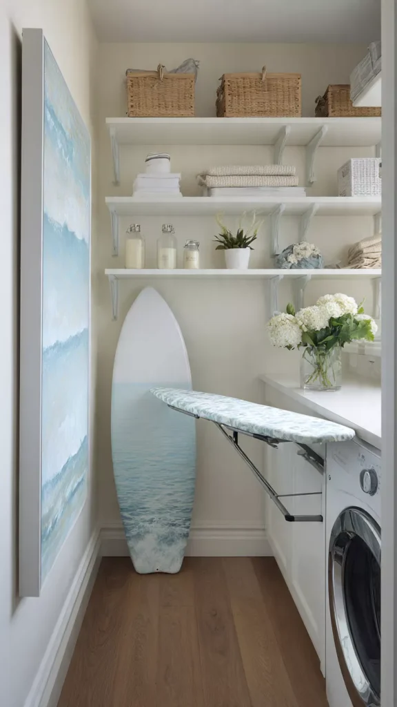 Forget the bulky, old-school ironing board that wobbles and eats half the room when opened. A fold-down version hides neatly against the wall and pops out only when you need it, saving loads of space while keeping your workflow smooth. It also gives your laundry area a surprisingly polished feel, almost like a boutique hotel’s back-of-house secret. If you’re someone who irons often—or even just occasionally—this upgrade feels like pure convenience. Pro Tip: Place it near an outlet so you don’t have to stretch cords across the room.