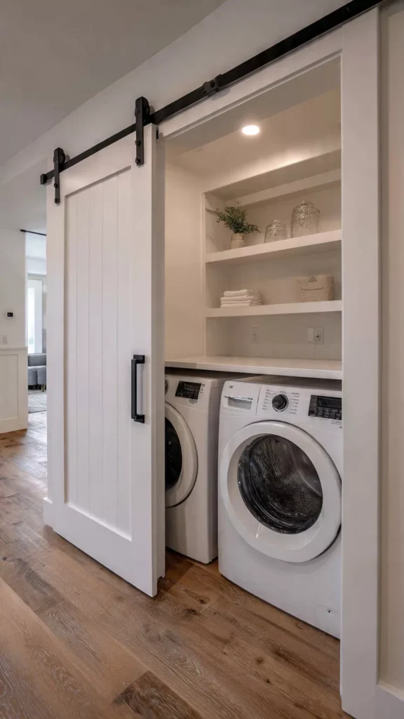 When square footage is tight, traditional swinging doors can feel like a total nuisance. That’s where sliding barn doors or pocket doors become game-changing heroes. They glide neatly out of the way, opening your laundry nook without stealing valuable room from nearby furniture or walkways. Plus, they add personality—rustic charm, modern sleekness, or even a colorful statement moment. And honestly, isn’t it wild how swapping just one door style can make the whole area feel bigger? Pro Tip: If a pocket door isn’t possible, try a wall-mounted barn door to achieve the same space-saving effect.