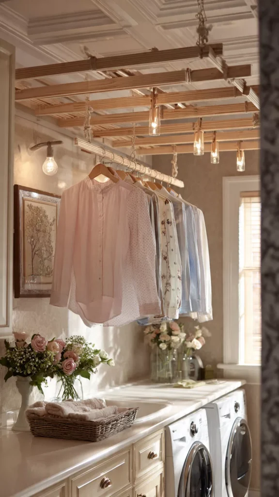 Overhead drying racks are perfect for small laundry rooms where wall space feels precious. They float above eye level, giving you a place to hang damp shirts, delicate sweaters, and freshly steamed outfits without cluttering your counters. The gentle lift-and-lower motion of some pulley-style racks also brings a charming old-world feel to the room. And in tiny homes or apartments, ceiling-mounted solutions often feel like a secret superpower you didn’t know you needed. Pro Tip: Choose a rack with wooden dowels to prevent clothes from slipping and stretching.