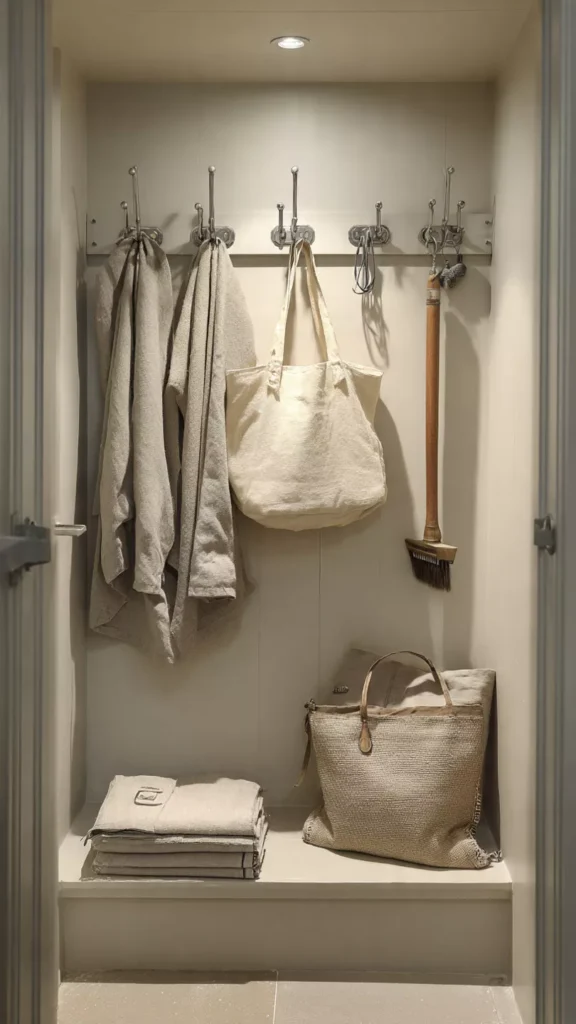 Hooks are the unsung heroes of organizational design, especially in small laundry spaces. They offer quick drop-zones for bags, hangers, cleaning tools, dusters, or even that one jacket you keep meaning to air out. By keeping everything off the floor and within easy reach, hooks help your room breathe while adding subtle structure to your daily routines. And let’s be real, sometimes the simplest solutions hit the hardest. Pro Tip: Choose sturdy metal hooks that can handle heavier items like mop handles or full laundry bags.