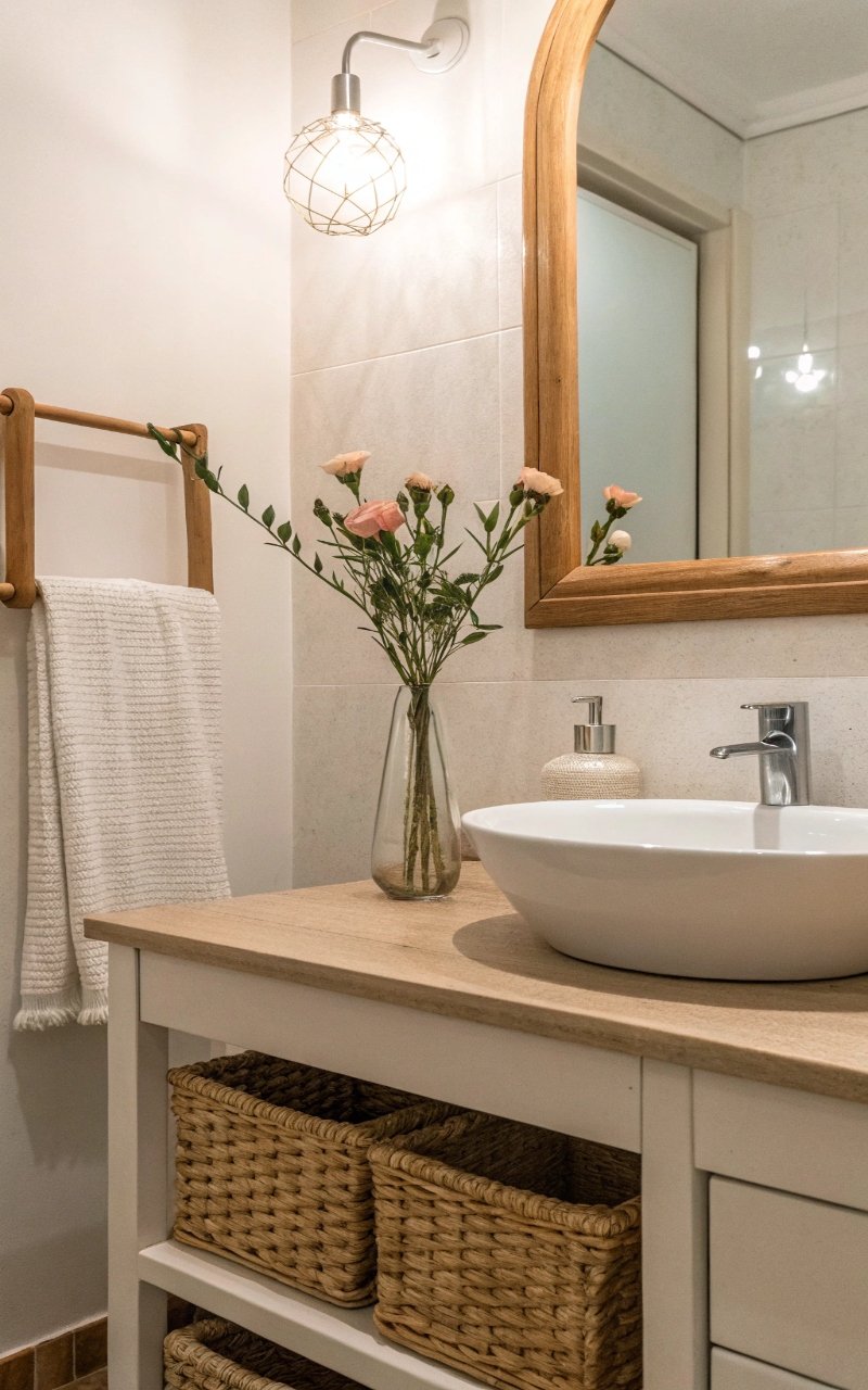 A small flower arrangement in the bathroom feels luxurious. I love how it elevates the space. Nothing feels basic. Doesn’t detail matter? It’s a small upgrade.