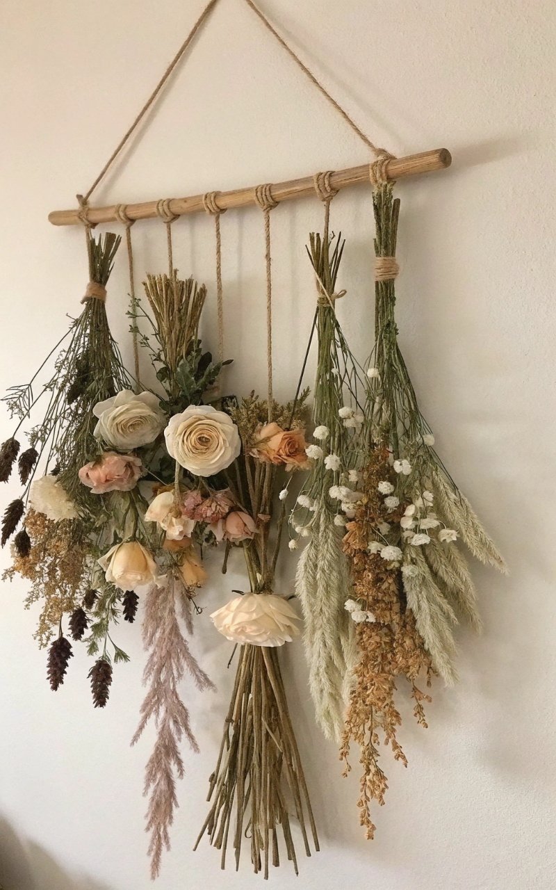 Hanging dried flowers adds texture. I love how it creates soft decor. The wall feels styled. Nothing feels empty. Doesn’t vertical decor add interest? It’s creative.