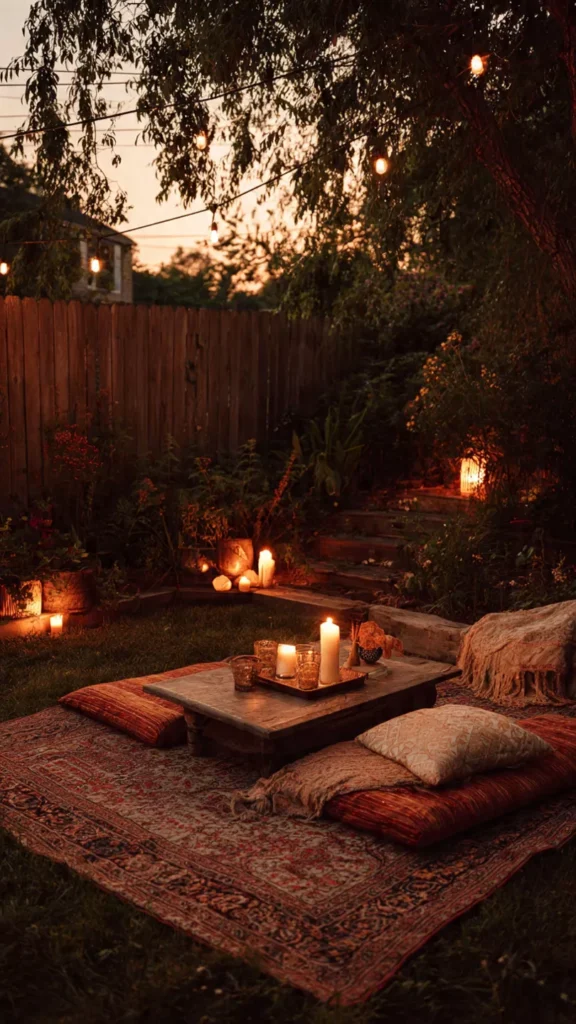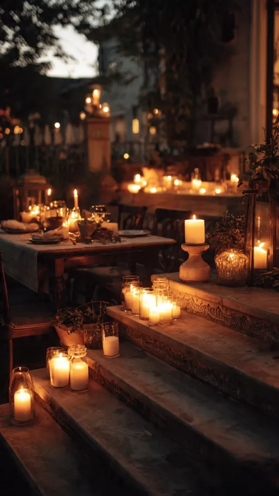 Scatter candles across tables, steps, and safe surfaces. The flicker reflects beautifully against the night sky. I love how candlelight instantly feels intimate. Doesn’t the dancing light create a dreamy atmosphere?