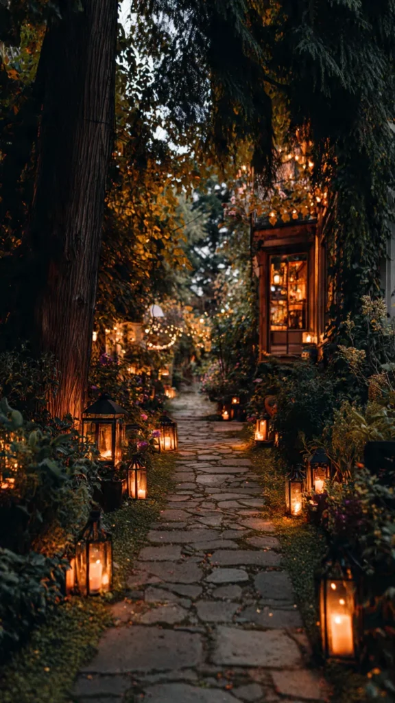 Lanterns lining the walkway guide you through the yard with gentle, romantic light. It feels like the beginning of a love story with every step. I always find lanterns so calming. Doesn’t that soft glow set the tone perfectly?