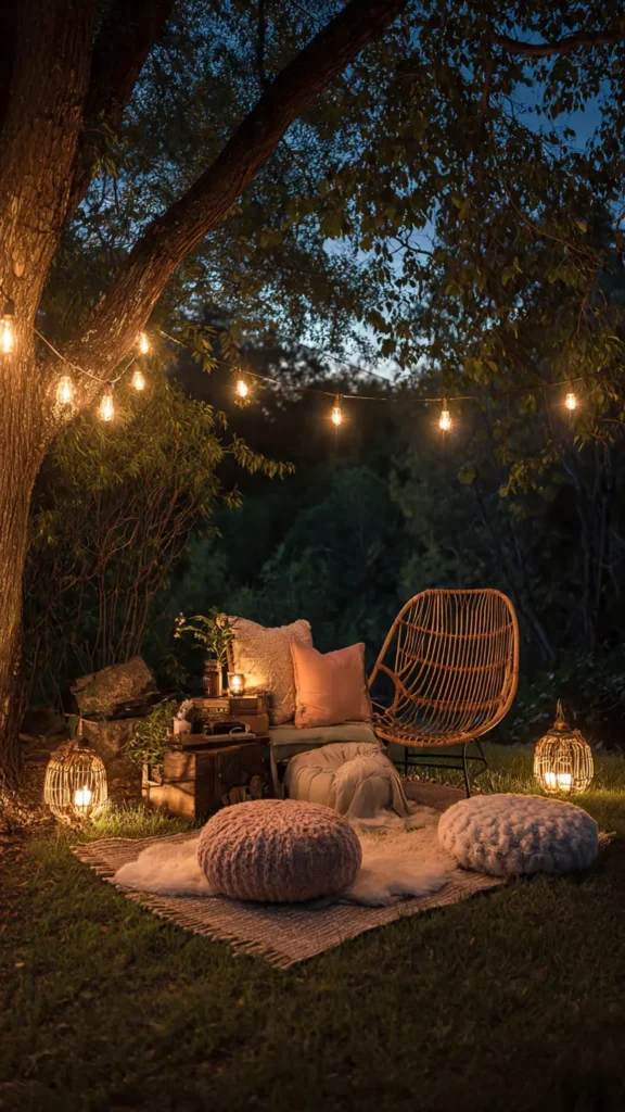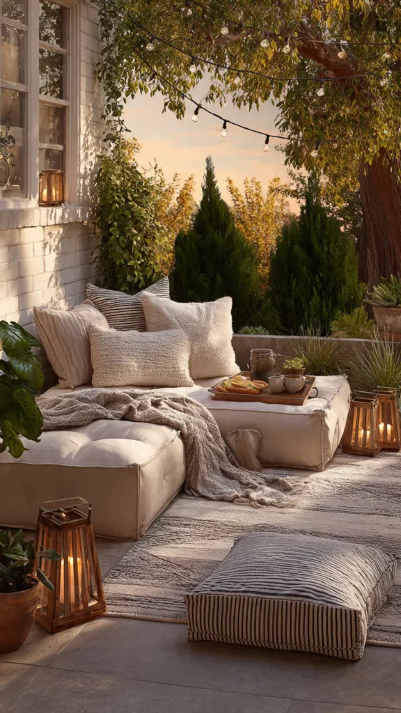 Arrange outdoor furniture, cushions, and throws into a relaxed lounge nook. It becomes the perfect spot for conversation or stargazing. I love the intimacy of a tucked-away corner. Doesn’t a cozy nook feel like a private escape?