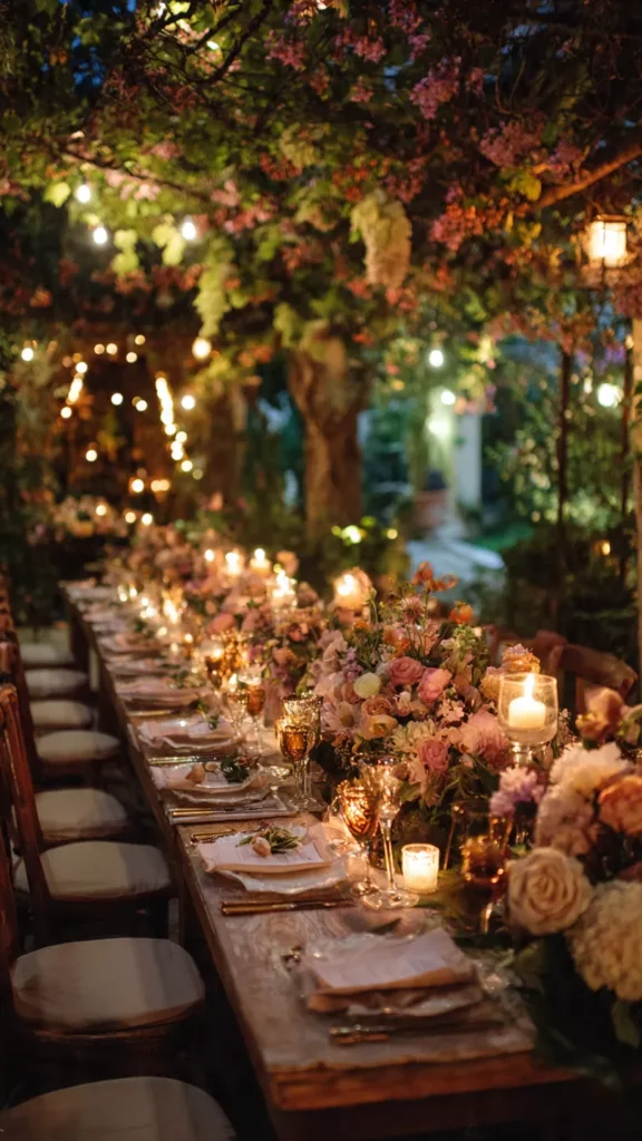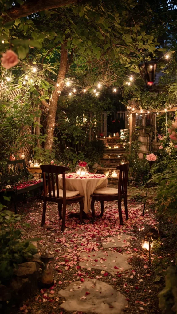 Scatter petals along the table, around the seating area, or across the lawn for a romantic flourish. It adds softness and whimsy. I always think petals feel like the final romantic detail. Doesn’t it feel like a scene from a love story?
