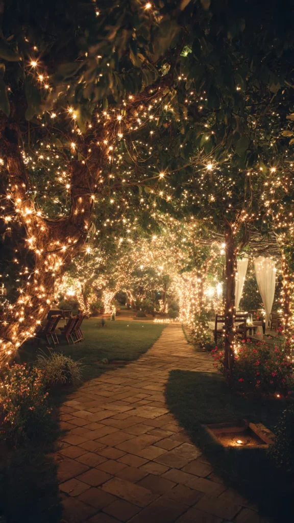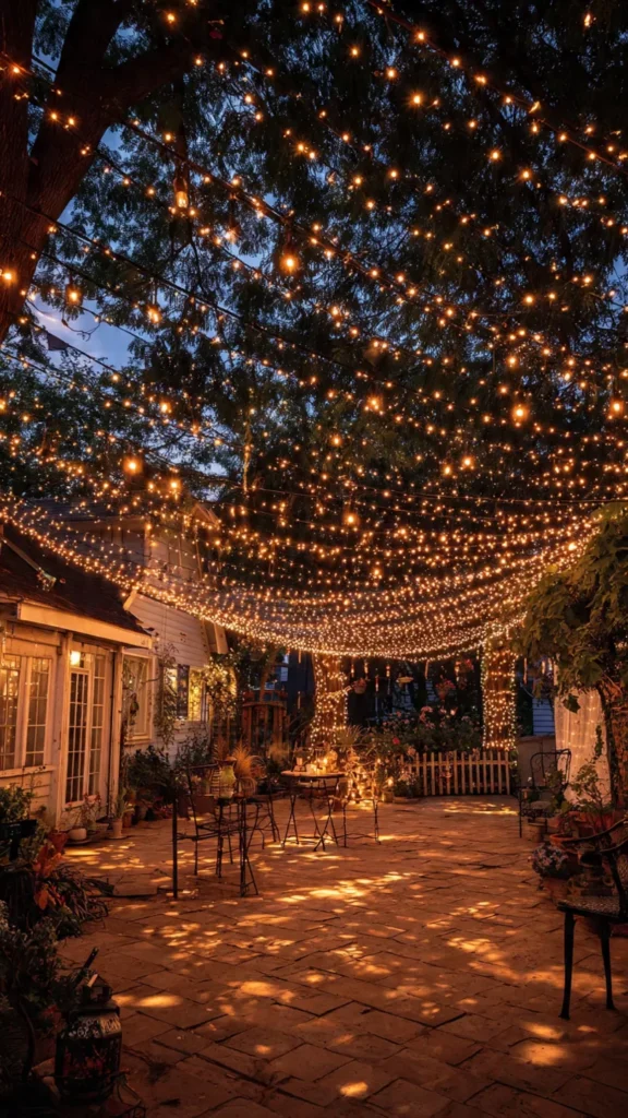 Drape string lights overhead to create a dreamy ceiling of warm, twinkling glow. The romantic atmosphere appears instantly. I always feel like I’m stepping into a movie scene under lights like these. Doesn’t soft lighting make everything feel more magical?