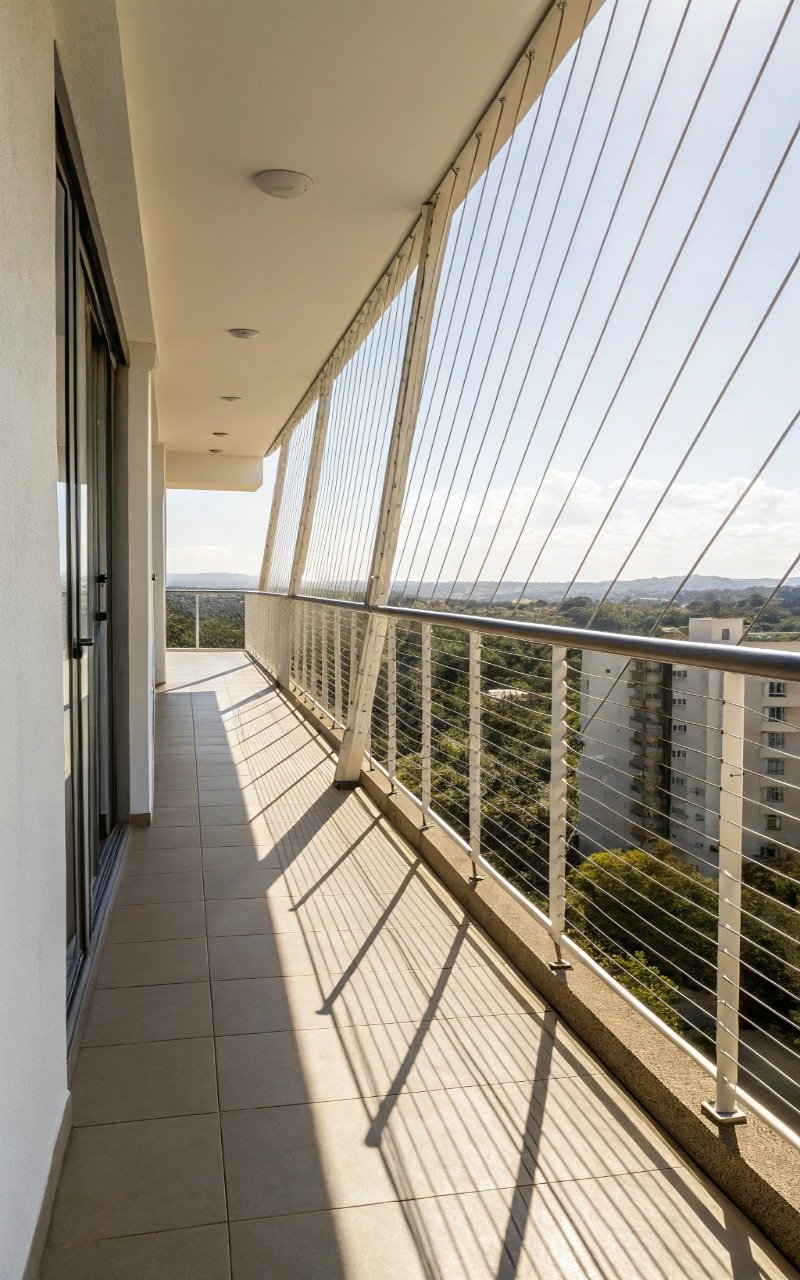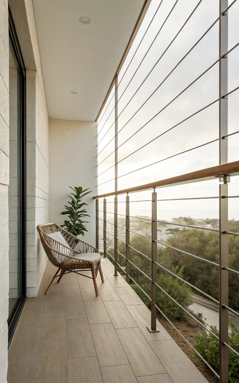 Cable railings use thin horizontal lines that barely interrupt the view, making them perfect for small spaces. The openness allows air and light to move freely. It feels modern and lightweight. The design doesn’t compete with the rest of the balcony. It’s subtle but effective. Pro Tip: Keep cables tightly tensioned.