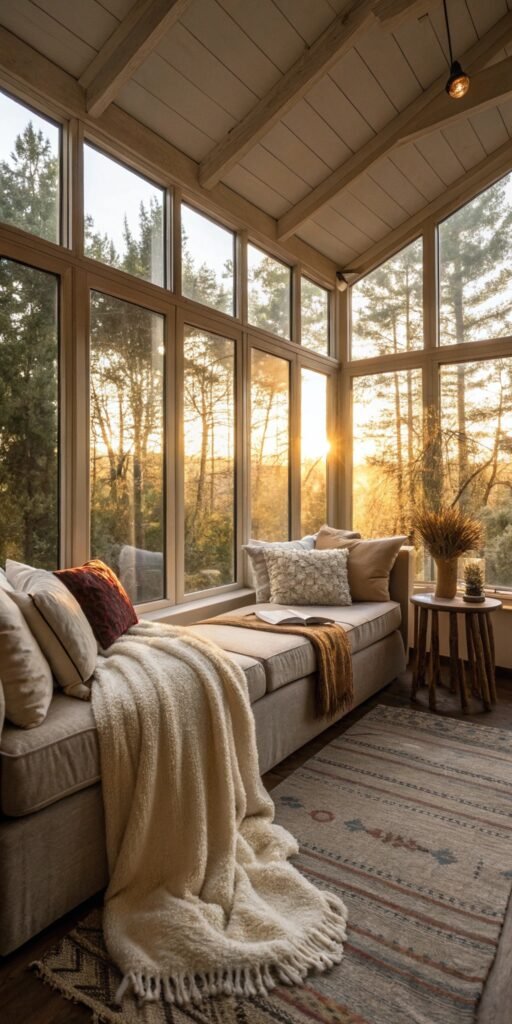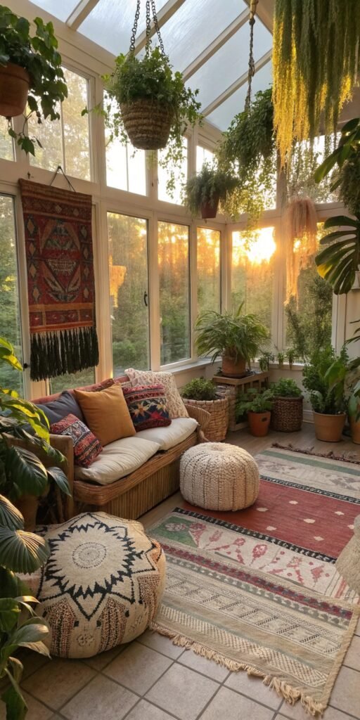 Boho sun rooms feel relaxed and layered. I love combining plants, cushions, and textured rugs. The sunlight enhances every pattern and fabric. The room feels cozy and creative. Doesn’t layering add personality? It’s warm and inviting.
