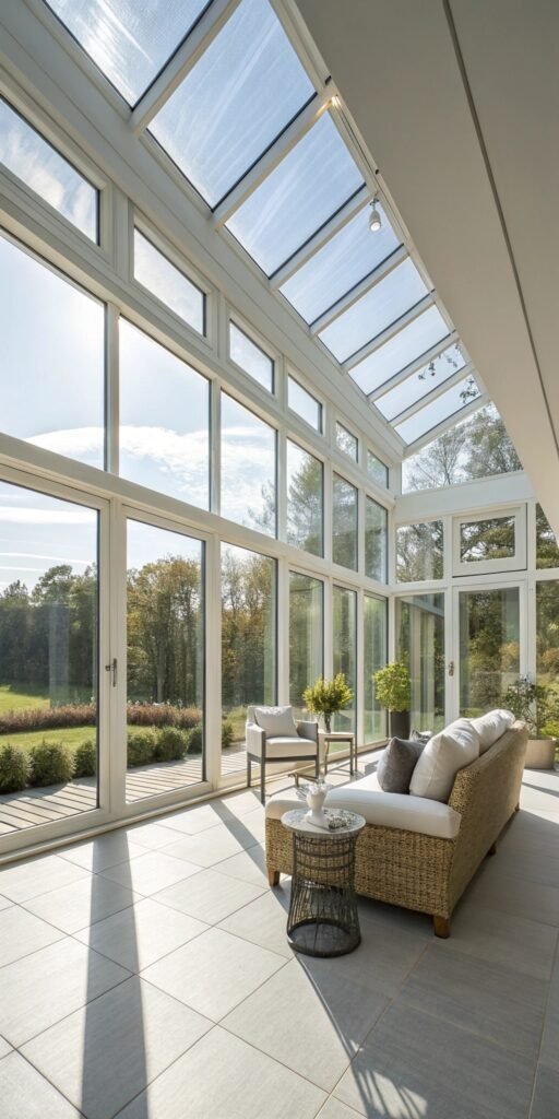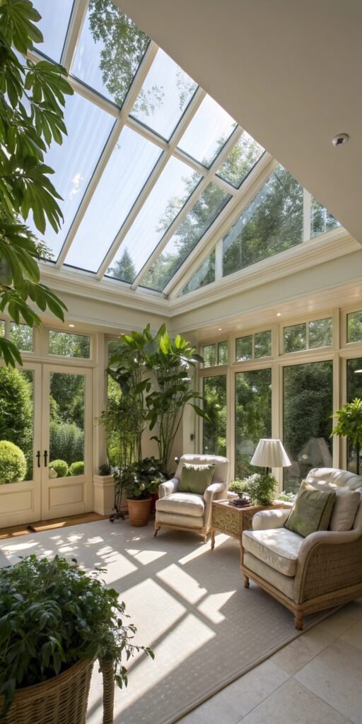 A lounge-style sun room encourages relaxation. I love deep sofas and soft throws near the windows. The sunlight creates a warm, comforting atmosphere. Nothing feels formal. Doesn’t a cozy lounge feel inviting? It’s the perfect place to unwind.