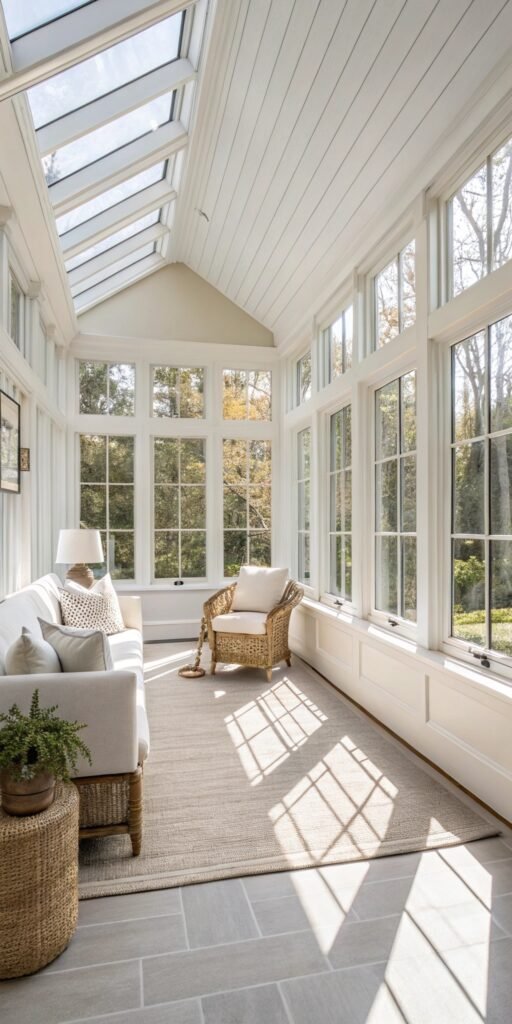 Coastal sun rooms feel breezy and bright. I love using soft blues, whites, and natural textures. The space feels like a seaside retreat. Nothing feels heavy. Doesn’t coastal style feel refreshing? It’s perfect for sunny spaces.