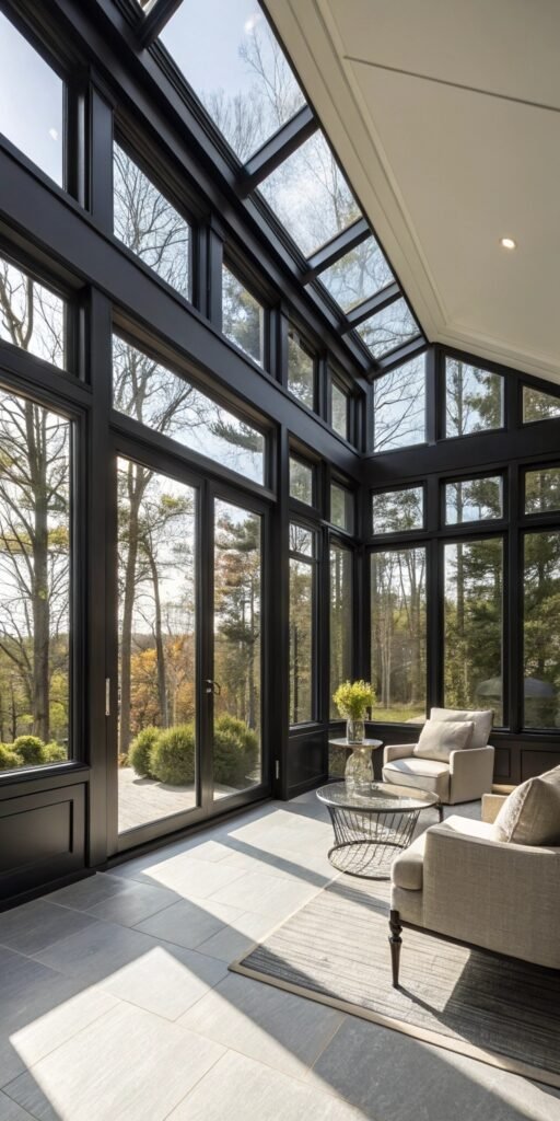 Black window frames create bold contrast. I love how the dark lines highlight the glass panels. The room feels modern and architectural. Nothing feels plain. Doesn’t contrast add drama? It’s sleek and stylish.
