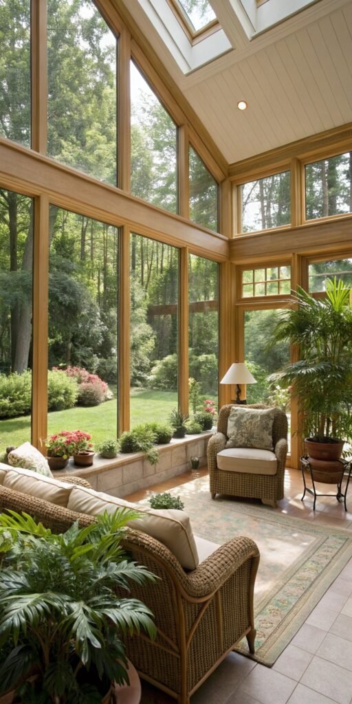 A sun room overlooking the garden feels magical. I love how the windows frame outdoor greenery. The room feels connected to nature. Nothing feels enclosed. Doesn’t a view change everything? It’s peaceful and scenic.