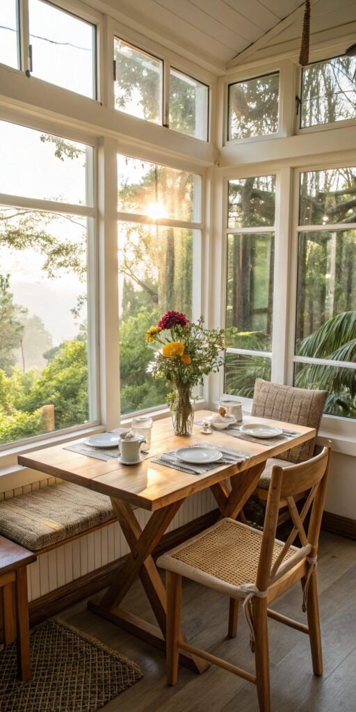 Dining in a sun room feels special. I love placing a small table where sunlight pours in. Meals feel brighter and more relaxed. Nothing feels ordinary. Doesn’t natural light improve everything? It’s perfect for brunch or coffee.