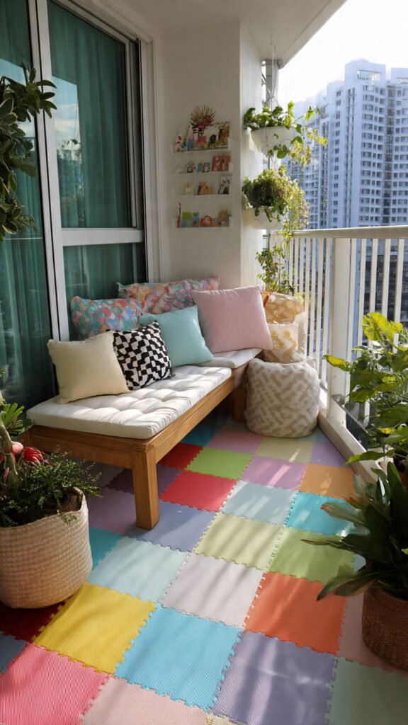 Layering small mats creates a fun patchwork effect. I love how it adds color and texture cheaply. The balcony feels playful and unique. Girls love choosing where to sit. Doesn’t variety keep things interesting? This look feels creative.