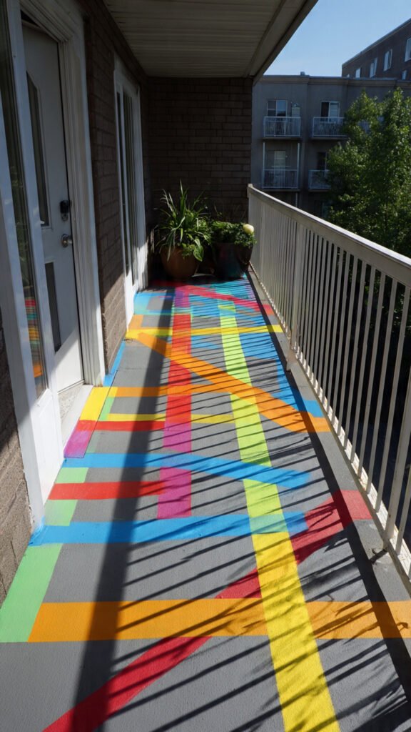 Colored tape creates instant games like hopscotch or paths. I love how cheap and interactive this is. The balcony feels active and fun. Girls invent new games daily. Doesn’t movement encourage creativity? It keeps energy flowing.
