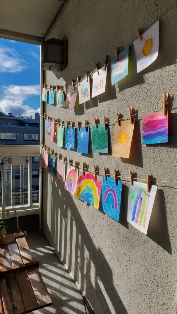 Hanging artwork with string and clips is inexpensive and meaningful. I love how girls proudly display their creations. The balcony feels personal. Creativity feels celebrated. Doesn’t recognition boost confidence? This idea always feels special.
