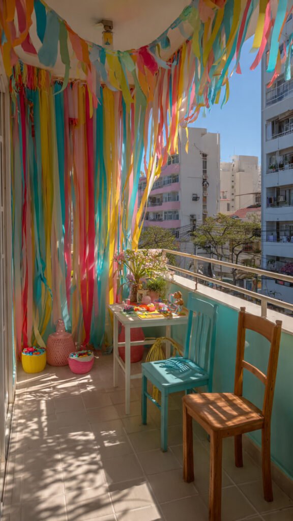 Crepe paper streamers are affordable and colorful. I love how they move with the breeze. The balcony feels lively and fun. Girls love watching them flutter. Doesn’t movement make spaces feel playful? It adds magic.