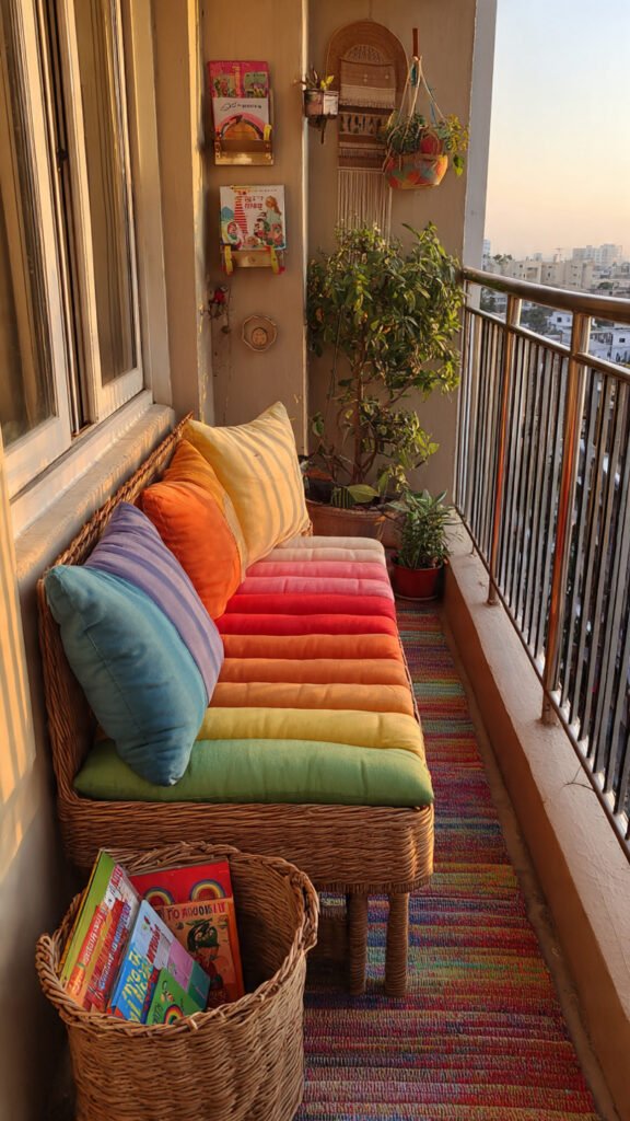 A rainbow-themed reading corner feels cozy and encouraging. I love how colorful cushions make books more inviting. The balcony becomes a calm retreat. Girls linger longer. Doesn’t comfort help kids slow down? Reading nooks work beautifully.