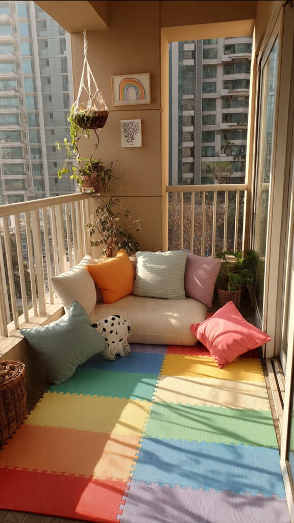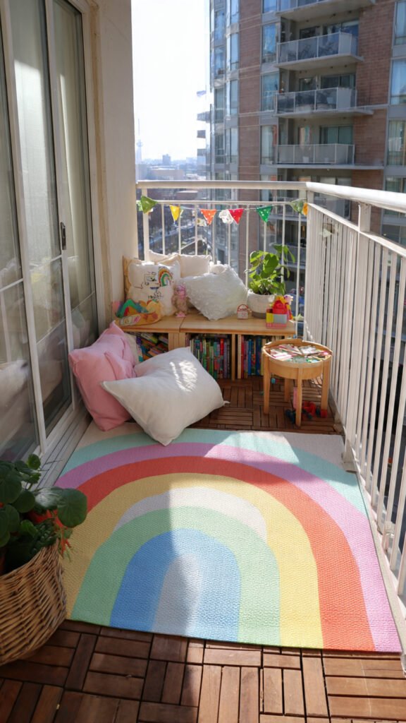 A simple rainbow mat instantly defines the balcony play zone. I love how it softens the floor and adds color without effort. The space feels warmer and safer. Girls naturally gather there. Doesn’t color underfoot change how a space is used? Rugs make a big difference.