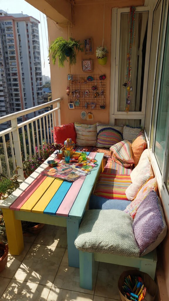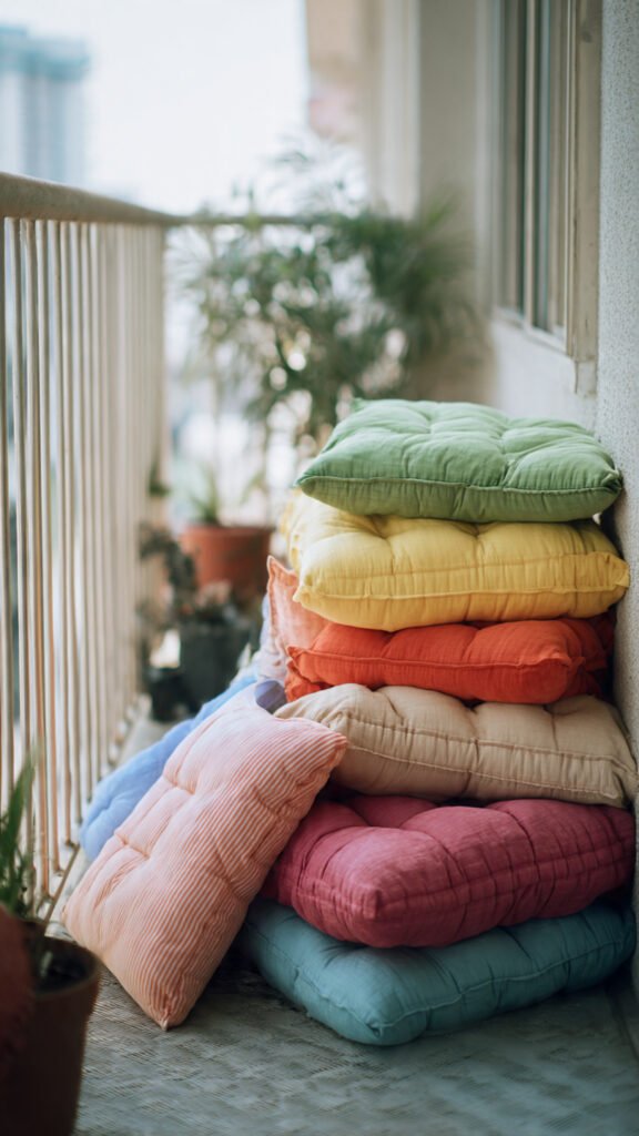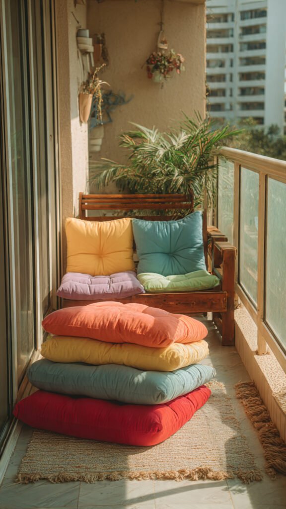 DIY cushion covers are affordable and customizable. I love using fabric scraps or old clothes in rainbow tones. The balcony feels personal and cozy. Nothing feels store-bought or stiff. Doesn’t DIY add warmth? It always does.