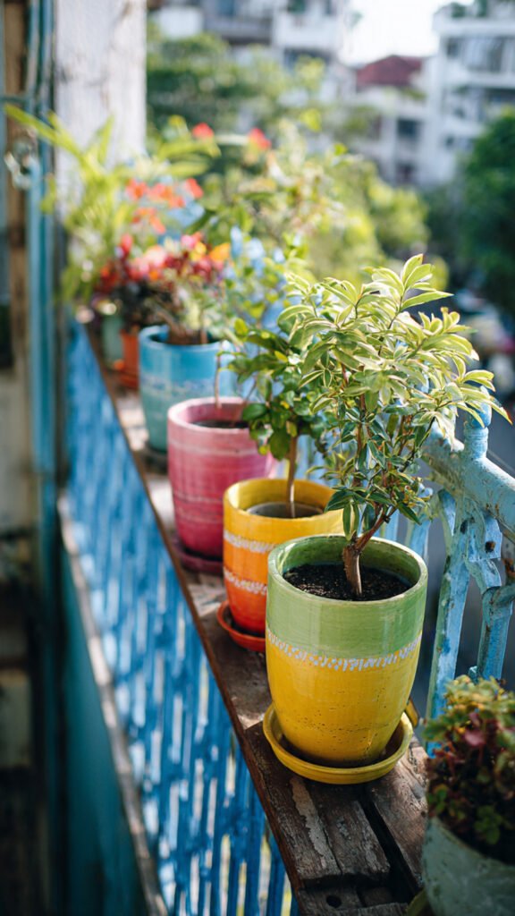 Plain pots become adorable with a little paint. I love how rainbow-painted pots add color without clutter. The balcony feels cheerful and creative. Plants look even happier. Doesn’t art make spaces feel more alive? This is budget-friendly joy.