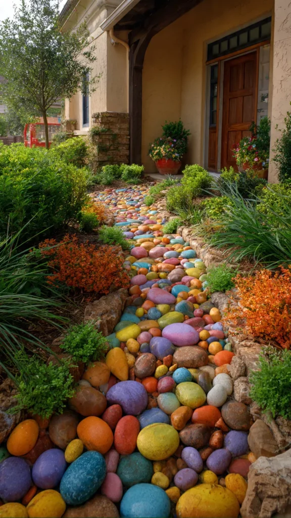 Painted or naturally colorful stones add fun texture and whimsy to the yard. They’re especially great for low-maintenance spaces. I love how kid-friendly and creative they feel. Doesn’t it spark a little joy?