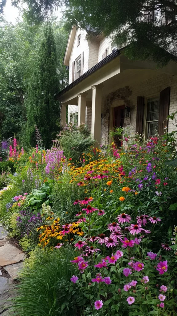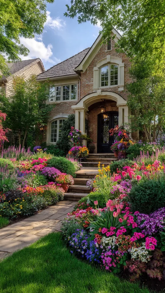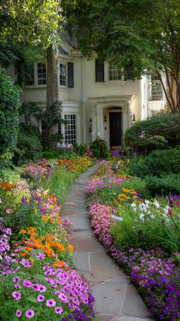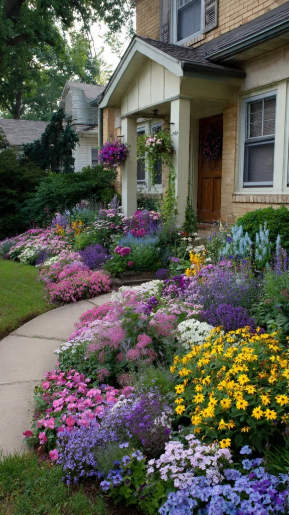 A flower bed filled with bright blooms instantly transforms the front yard. Pinks, purples, yellows, and blues create joyful energy right where guests enter. I love how color here feels like a warm hello from your home. Doesn’t it make the entrance feel friendlier?