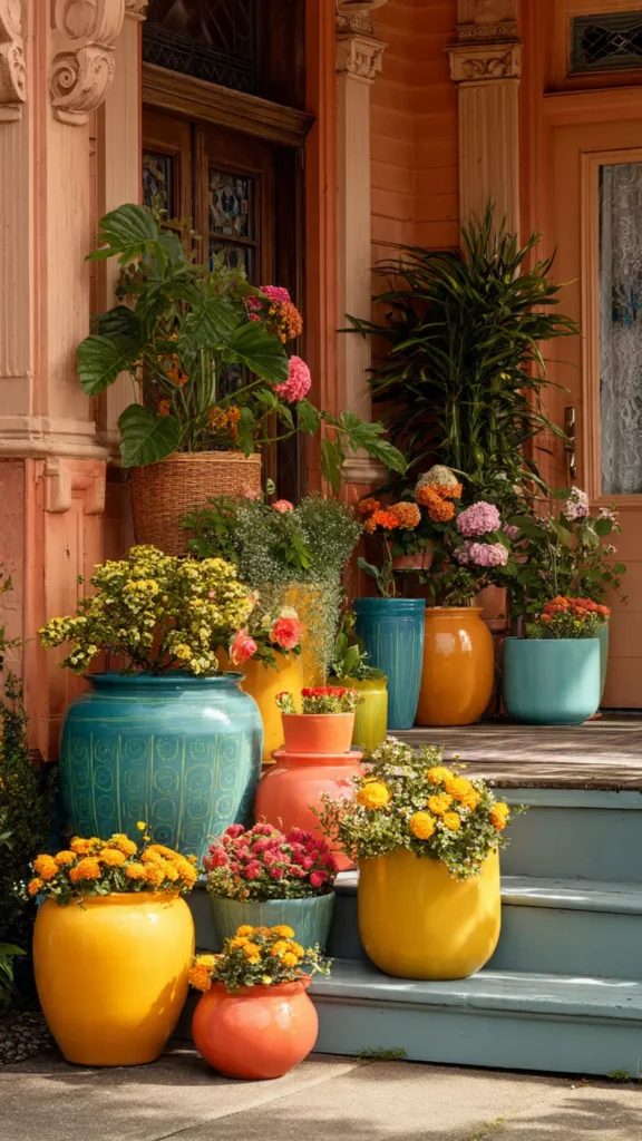 Vibrant pots in teal, coral, mustard, or terracotta add instant character—even before you fill them with plants. I love how they look like little pops of personality scattered across the yard. Doesn’t color in layers feel extra fun?
