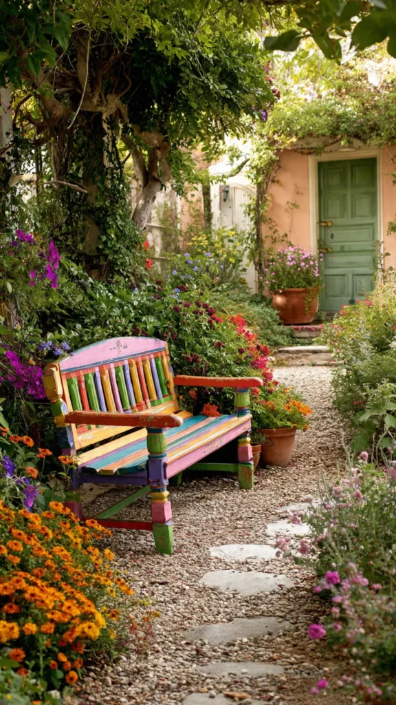 7. Add a Colorful Garden Bench