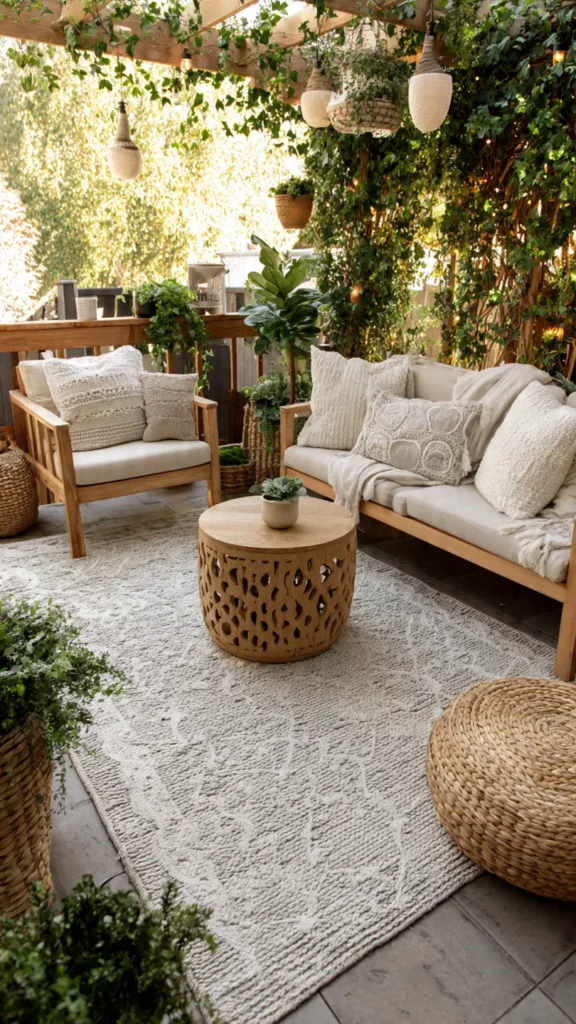A soft, durable rug under a seating area grounds the space and makes it feel like an outdoor living room. I love the comfort it adds underfoot. Doesn’t texture make relaxation easier?