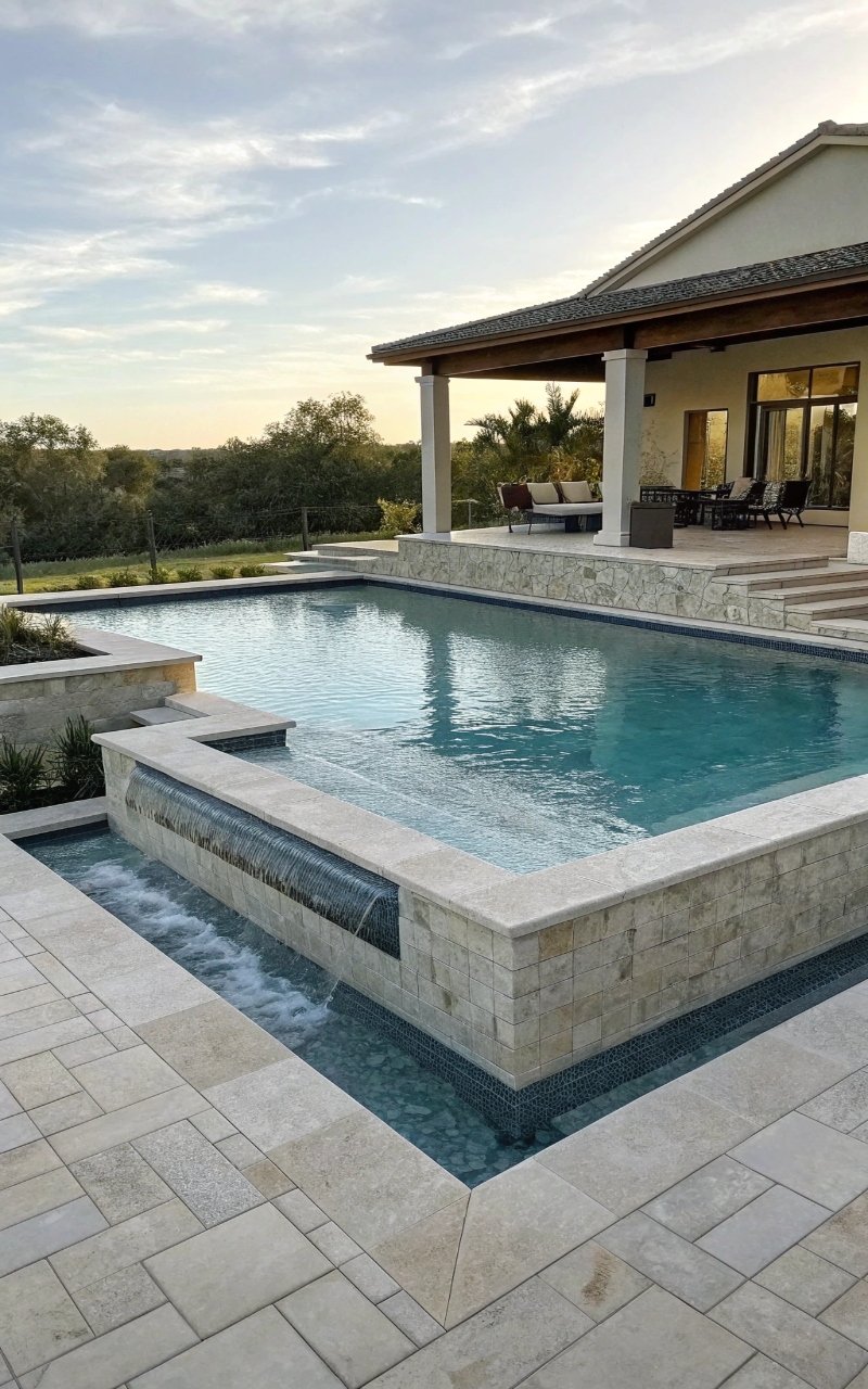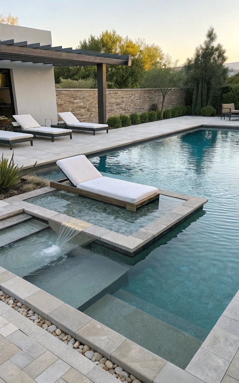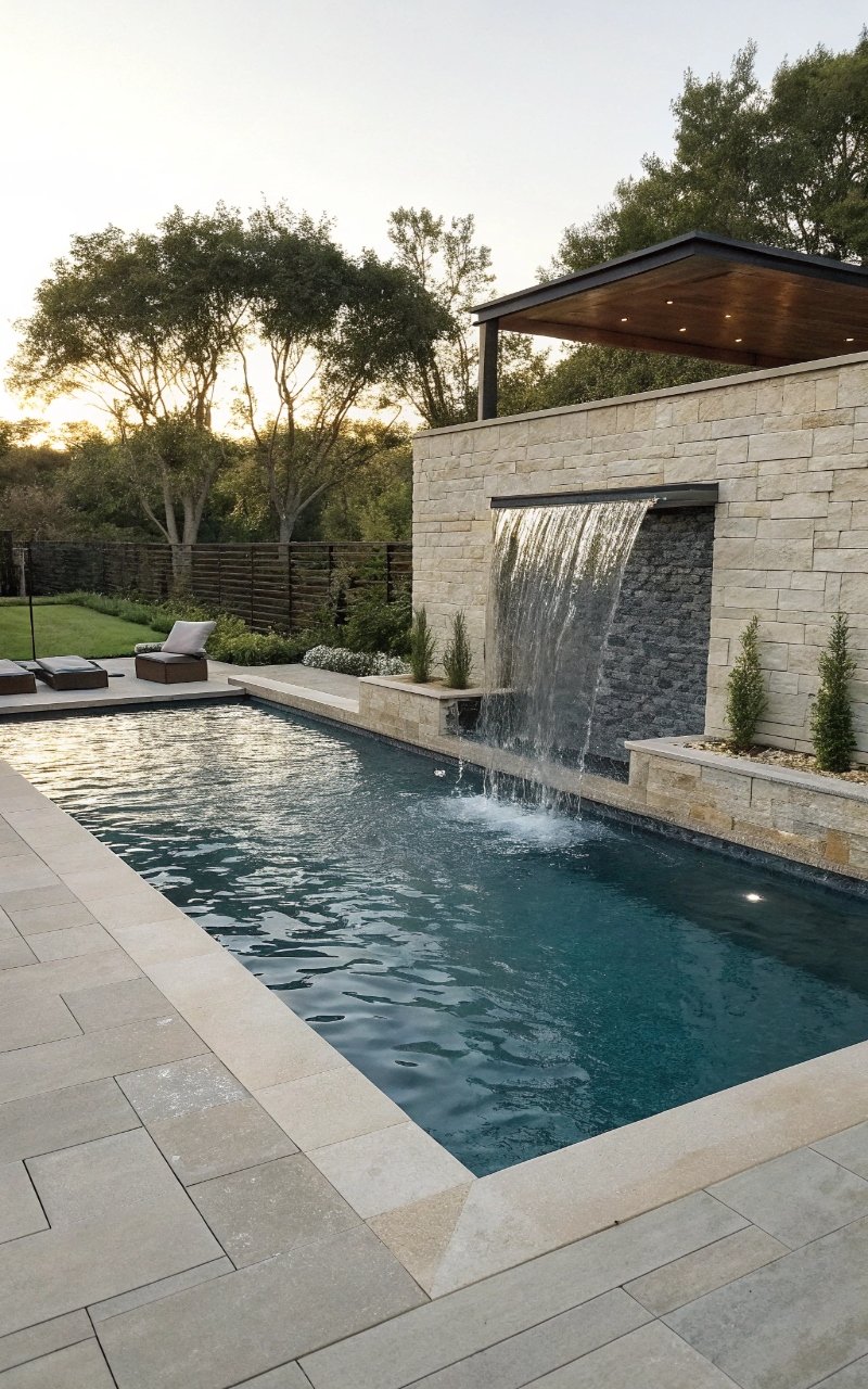 A simple waterfall wall added movement and sound that made the pool feel more high-end without changing the whole design. The sound softens the space beautifully. The feature adds a focal point. It feels polished and calming. It’s simple, but elevated. Pro Tip: Keep the wall design clean for a modern look.