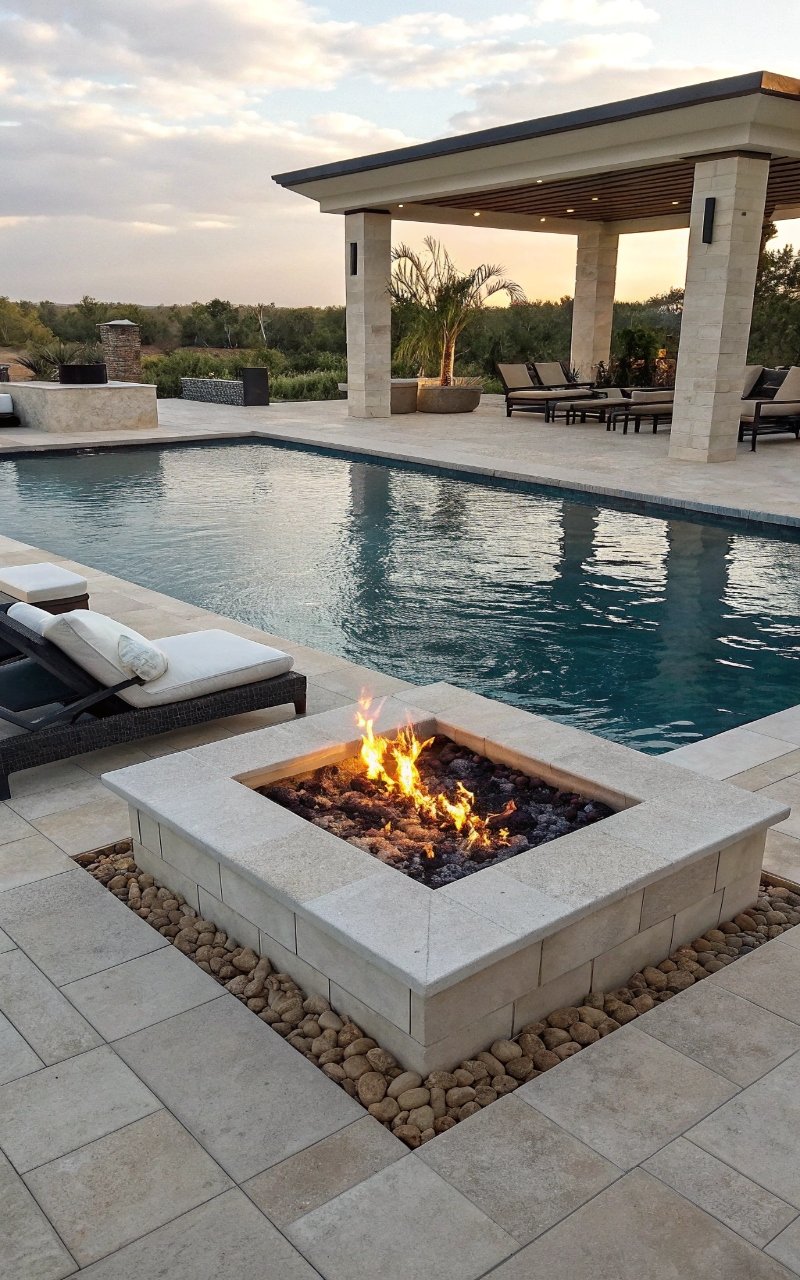 Adding a sunken fire pit near the pool made the whole space feel more social once the sun went down. It creates a natural gathering spot. The contrast of fire and water feels striking. The setup extends pool use into evening. It’s simple, but unforgettable. Pro Tip: Keep enough distance for safety and comfort.
