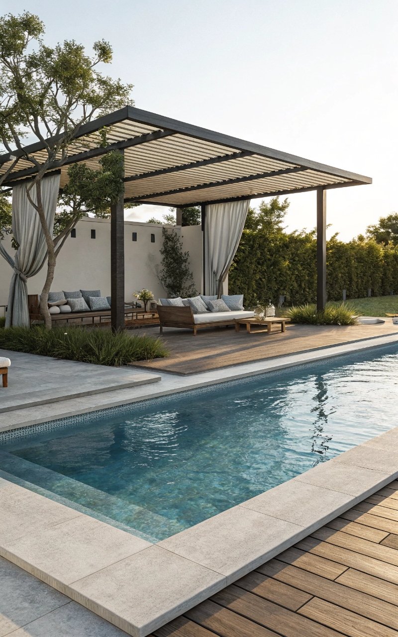 I added a pergola beside the pool, and it created a shaded retreat that made the whole setup more usable in hot weather. The structure adds comfort and definition. It makes the area feel more complete. The shade changes everything. It’s simple, but so worth it. Pro Tip: Add curtains for extra privacy and softness.