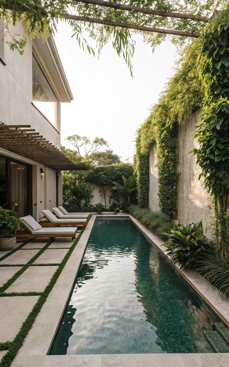 I enclosed the pool with greenery and seating, and it made the whole space feel more private and intimate. The layout feels sheltered and calm. It creates a stronger sense of retreat. The setup feels cozy and intentional. It’s simple, but luxurious. Pro Tip: Use layered planters for a softer edge.