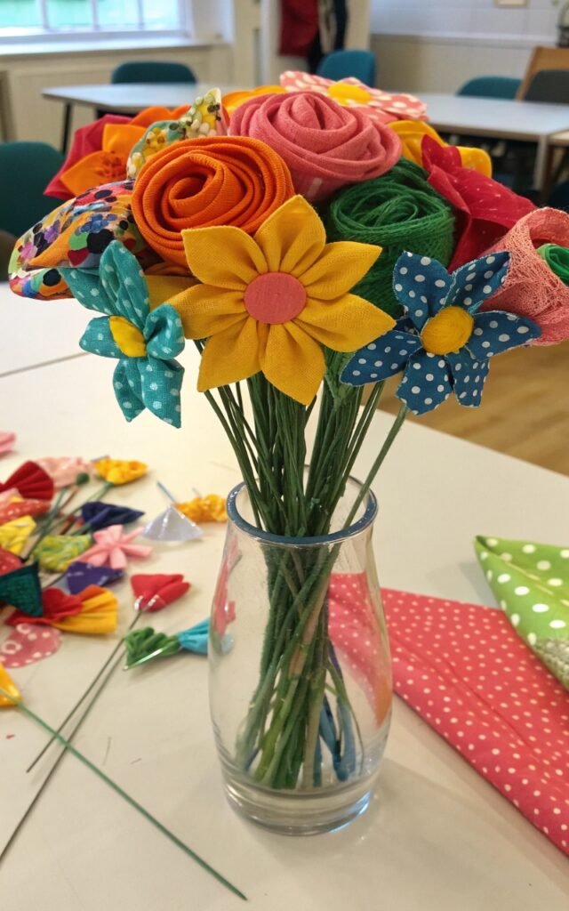 Fabric flowers never wilt. I love shaping colorful fabric scraps into simple blooms. The bouquet looks cheerful and creative. Nothing fades over time. Doesn’t handmade flowers feel special? It’s a lasting decoration.