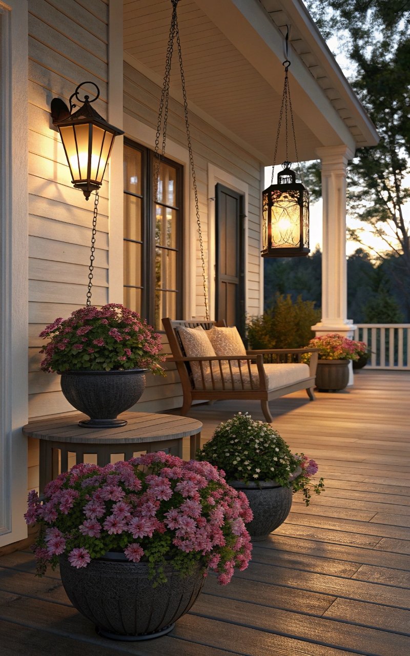 Adding lanterns alongside pots created a cozy evening vibe. The soft lighting and layered decor make the porch feel warm and inviting. I love how it adds atmosphere. It’s simple but impactful. Doesn’t lighting change everything? This one definitely does.