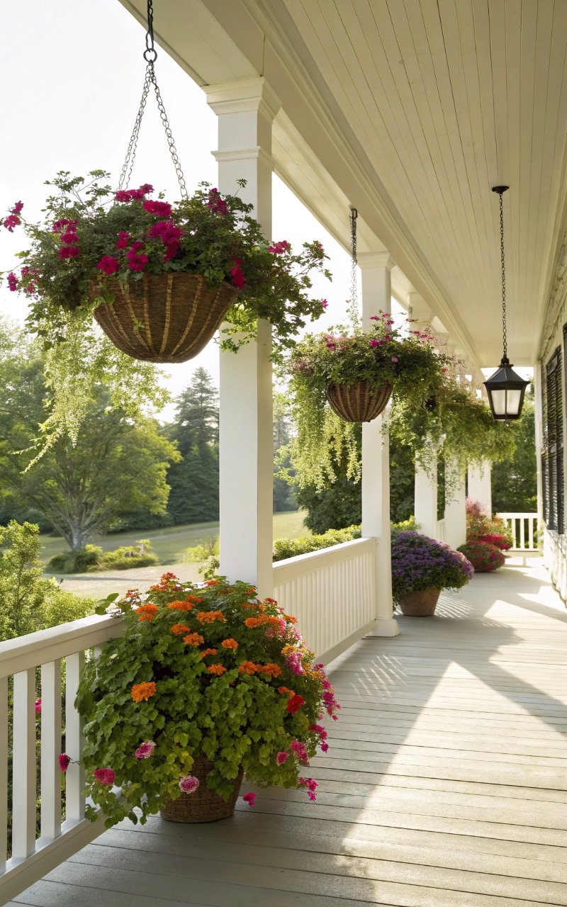 Adding hanging baskets brought movement and softness to the porch. The floating greenery and cascading flowers create a charming, airy look. I love how it draws the eye upward. It feels lively and inviting. Doesn’t hanging decor add something special? This one definitely does.